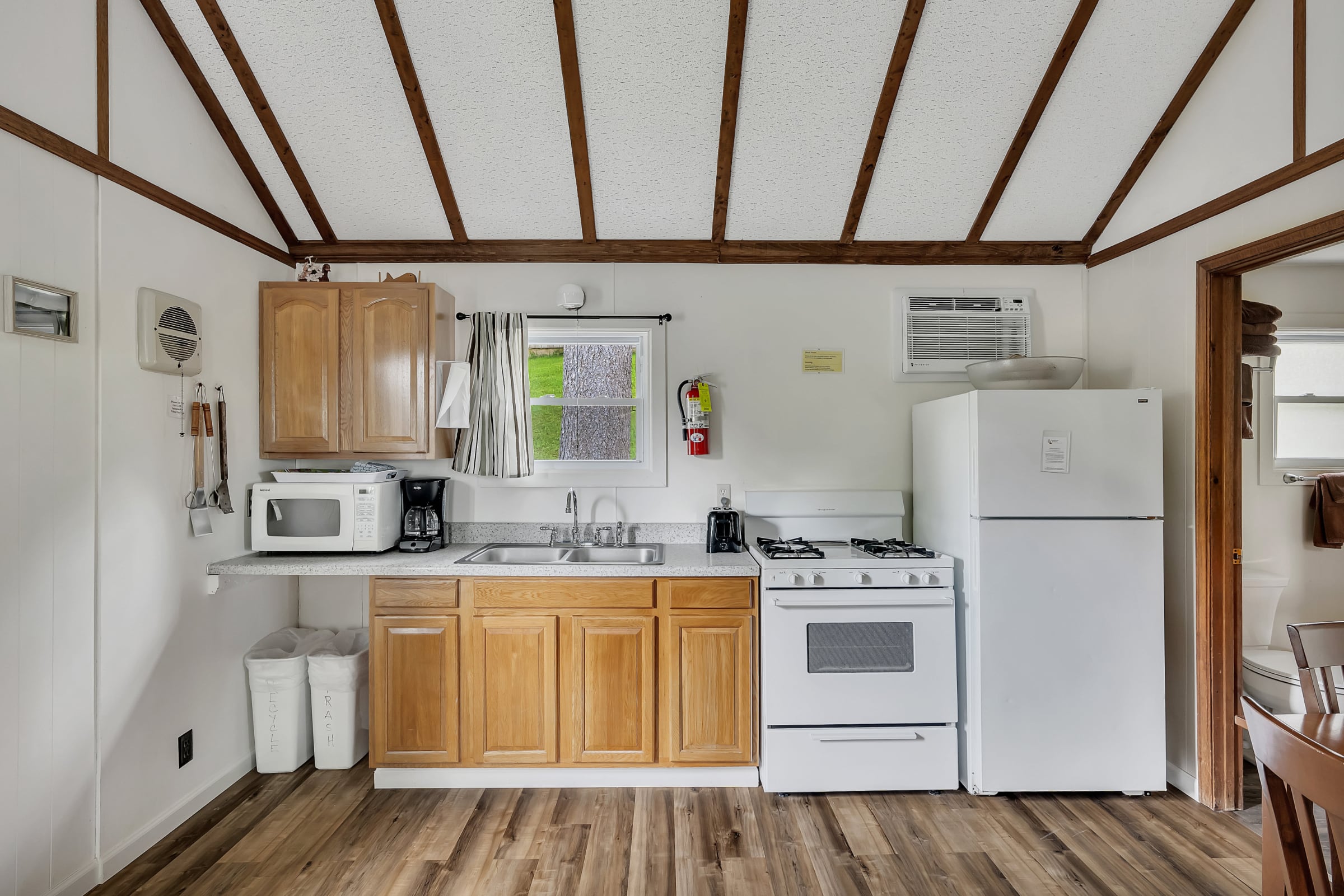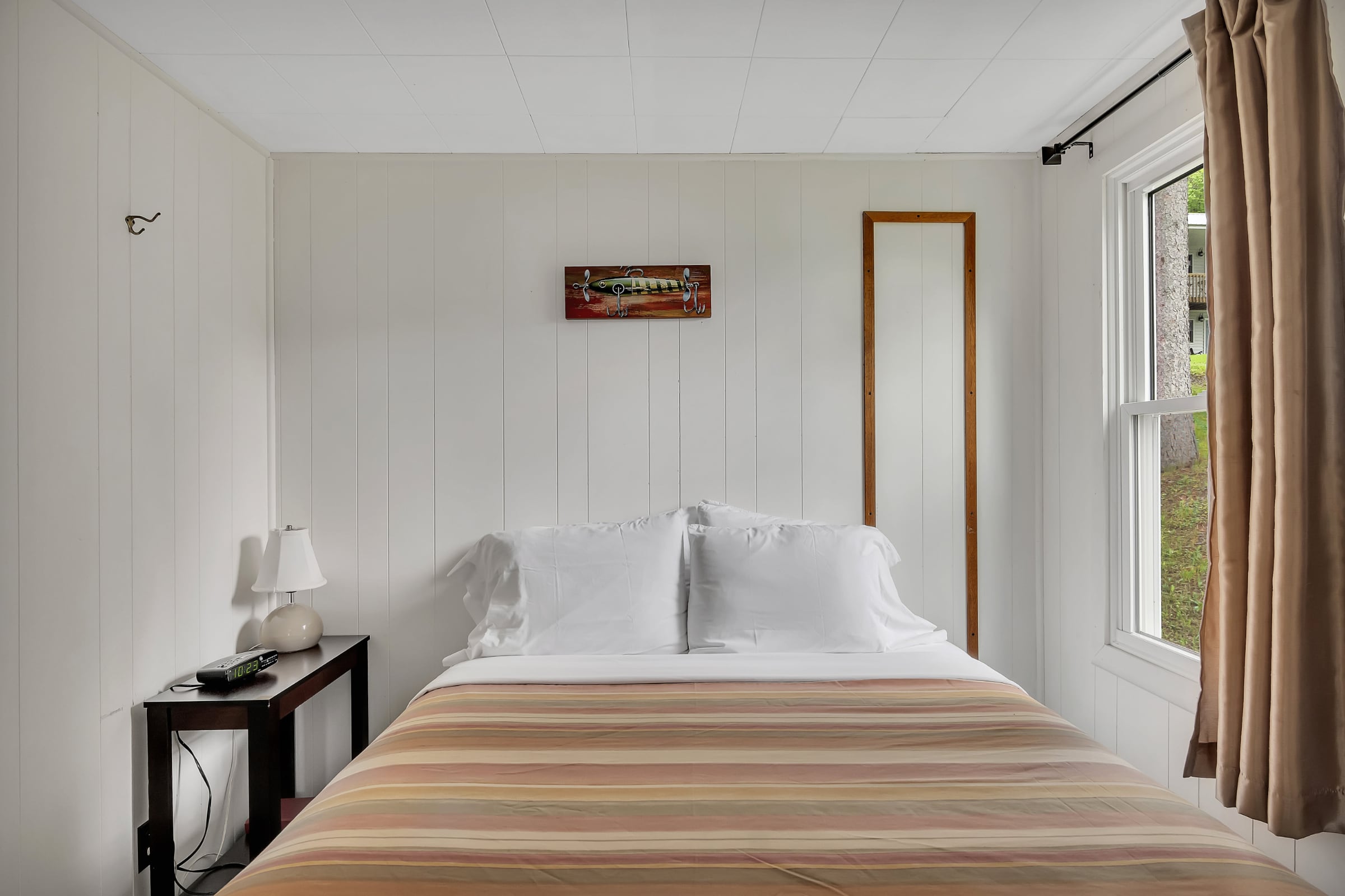 Cottage E is one of our cozy "rustic" cottages — tucked into the woods, with a lake view from its front porch. It has one bedroom with a queen bed, and one pull-out sofa in the main room.
